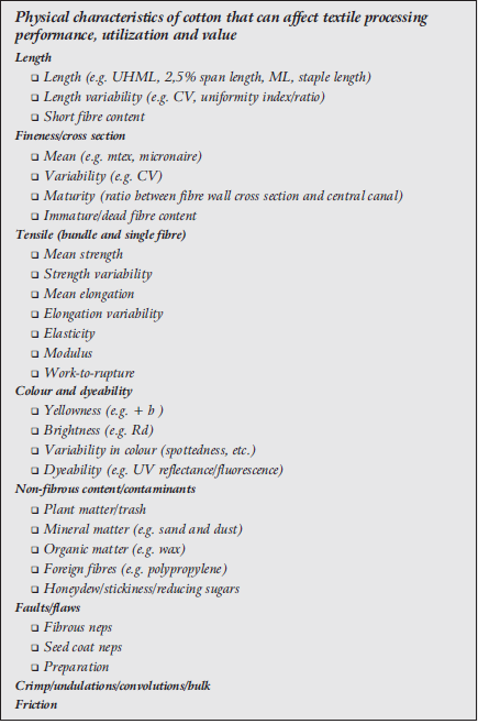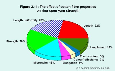棉纤维正面临着来自人造纤维,特别是聚酯纤维的竞争。棉花是一种天然产品,广泛的纤维特性、物理和化学(主要是物理),由于遗传、环境、收割、轧花因素。基本上有四种:媒体商业化种植的棉花纤维长度和中细棉花,美国陆地(约占全球棉花产量的90%);长绒棉和细棉;而短的粗棉和G.草棉(统称为德西棉)。物理,化学和棉花相关的特征,包括类型和非纤维物质存在的纤维配置数量”(准备、棉结等),确定其纺织加工性能和行为,在处理废物和效率方面(包括机器停工和纺纱断裂)和纱线和织物的质量(见图2.10和2.11)。终这些特性也决定了转换成本和产品终用途,价格和质量。
