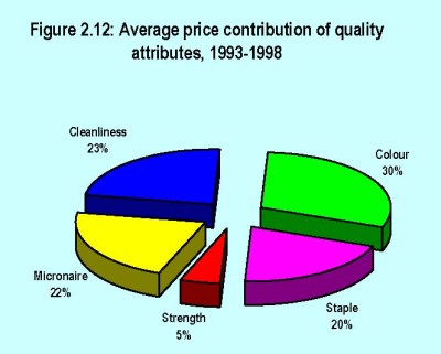 纤维代表纱线生产成本的50%,70%。因此,理想的情况下,棉花的价格应该与纤维特性有关。棉纤维的价格和性能之间的关系已由Chakraborty等人调查(见图2.12);朋友杜森和纽豪斯也表表明棉花价格与纤维性能之间的联系。