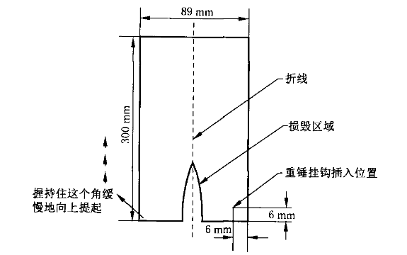 6、打开箱门,取出试样,在织物一端悬挂重锤测试损毁长度,测试方法如图所示。沿试样长度方向上损毁面积内高点折一条直线,然后在试样的下端一侧,距其底边及侧边各约6mm处,挂上选用的重锤,再用手缓缓提起试样下端的另一侧,让重锤悬空,再放下,测量并记录试样撕裂的长度,即为损毁长度,精确到1mm。